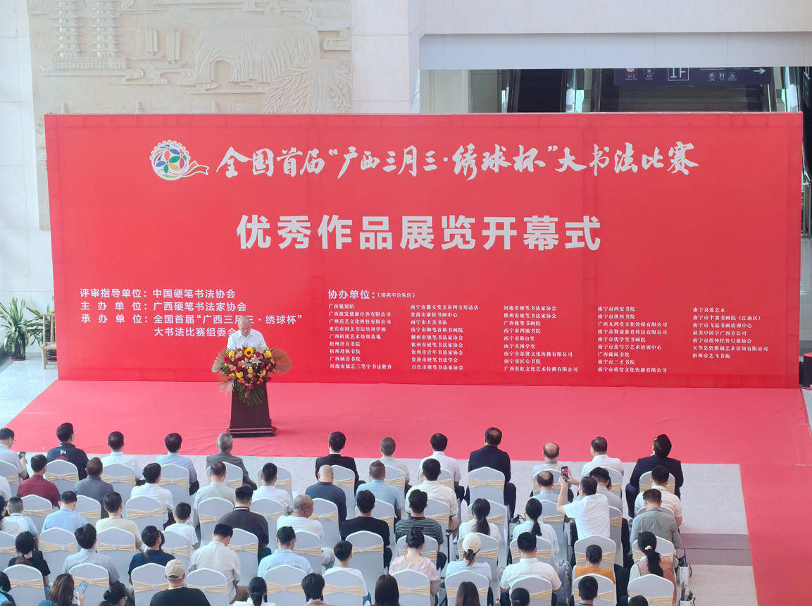 人民网南宁4月19日电(记者伍迁)4月19日,“铸牢中华民族共同体意识”全国首届“广西三月三·绣球杯”大书法比赛优秀作品展在广西规划馆开幕。活动由中国硬笔书法协会评审指导,广西硬笔书法家协会主办,来自全国各地的获奖作者、书法机构师生代表及各界书法爱好者约200人参加活动,共赴笔墨盛会。