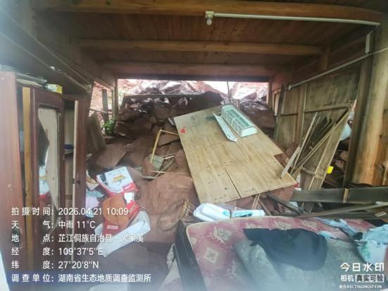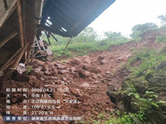 4月20日11时,洪江市江市镇双龙村驻村工作队队长覃庆与村党支部书记罗学珍带队在双龙村1组开展隐患排查时,发现脱贫户黄辉房屋后山体土层裂隙发育、开裂,存在滑坡风险、迅即组织黄辉户4名群众就近转移安置至双龙村村部应急避难场所。当晚22时,该住户后方山体发生大规模塌方,直接冲垮一处附属房屋,未造成人员伤亡,1户4人成功避险。